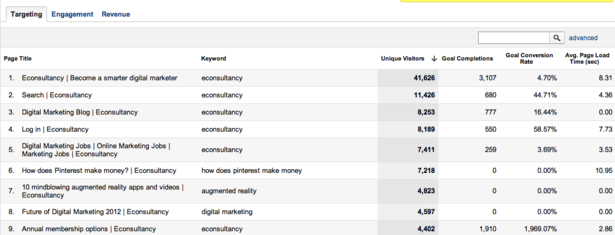 Dit rapport bekijkt je meest populaire zoekwoorden (min de (not provided) opdrachten) en toont bezoekersmetrics, conversie percentages, behaalde doel en pagina laadtijd.