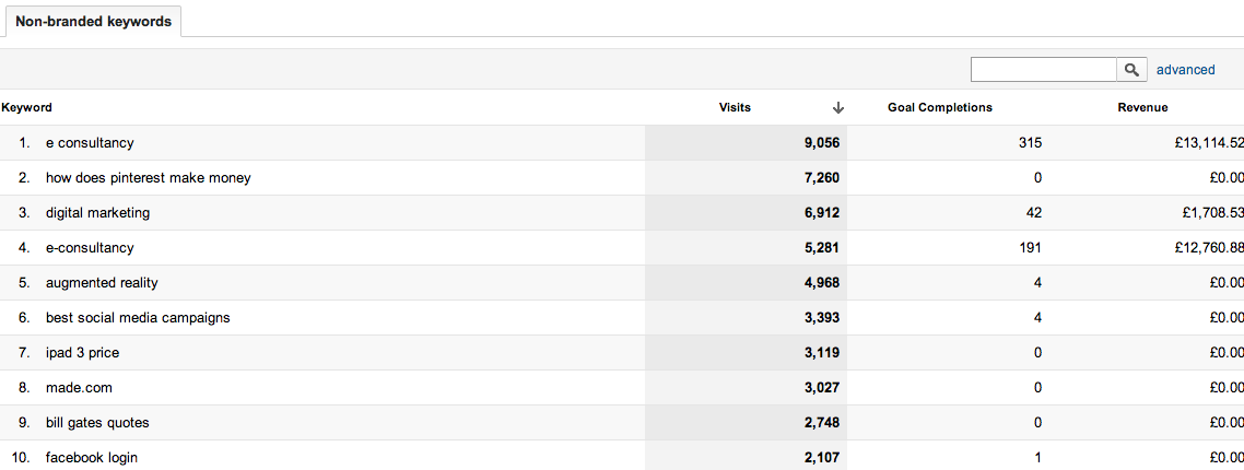 Je moet zelf nog wel even het rapport aanpassen om je eigen branded zoekwoorden te filteren. In dit geval is ‘econsultancy’ gefilterd, maar denk er aan om ook andere spellingen van je merknaam te filteren: