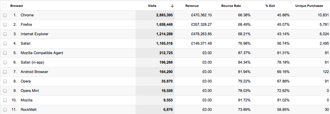 Het is ook een goede manier om aanvankelijke problemen op te pikken. Als bounce rates heel hoog zijn voor een specifieke browser, is er misschien een probleem met hoe je website er uit ziet in Internet Explorer, Safari etc.