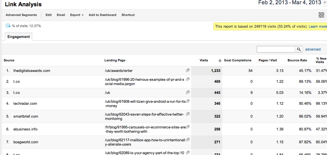 Dank aan Anna Lewis van Koozai voor dit rapport, dat de referring sites toont naast de voltooide doelen en conversie percentages.