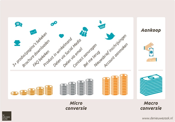 Bezoekers komen met verschillende beweegredenen naar een webshop. Het doel van hun bezoek is in de meeste gevallen niet het direct kopen van een product. Hierdoor wordt het hoofddoel van de webshop vaak niet in het eerste of tweede bezoek bereikt. De bezoeker ondergaat verschillende stappen die hem/haar dichter bij het hoofd doel brengen. Door te identificeren welke stappen het meest efficiënt zijn, is het mogelijk om de toegevoegde waarde van deze stappen te bepalen. Daarom is het belangrijk dat de micro conversies en de macro conversie in kaart worden gebracht en vervolgens worden doorgemeten.