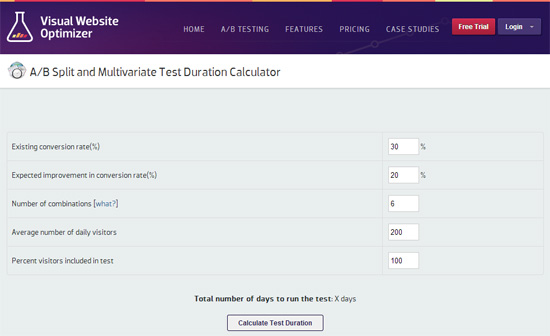 De tool zal je vertellen hoeveel dagen je de test moet laten lopen voor je betrouwbare resultaten kunt krijgen. De berekening is gebaseerd op het aantal versies dat je gaat testen, je website verkeer, je huidige conversiepercentage, etc.