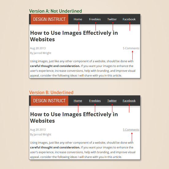 Groengekleurde hyperlinks zouden bijvoorbeeld beter kunnen presteren als blauwgekleurde hyperlinks, maar alleen als de groene hyperlinks vetgedrukt en niet onderstreept zijn. Maar de groene hyperlinks zouden slechter kunnen presteren dan de blauwe hyperlinks wanneer de groene versie cursief en onderstreept is.