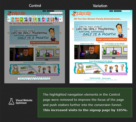 Op Visual Website Optimizer heeft een van hun klanten een test gerunt om te zien of het verwijderen van sommige navigatie-elementen van hun homepage zou leiden tot meer conversies.