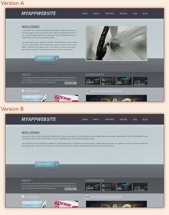 Stel je dit hypothetische scenario voor: de designer gelooft dat de stockfoto die zij gekozen heeft er fantastisch uit ziet met het design. Ze runt een A/B-test om te verifiëren dat het een goede designkeuze is. Ze creëert twee versies om te testen: een met de stockfoto (versie A) en een zonder de foto (versie B).