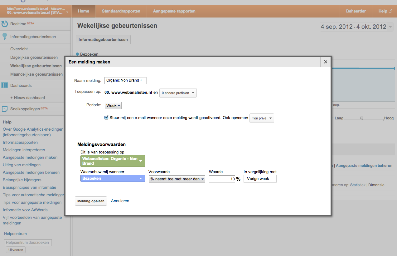 Een Custom Alert heet “een aangepaste melding maken” in de Nederlandse Google Analytics.