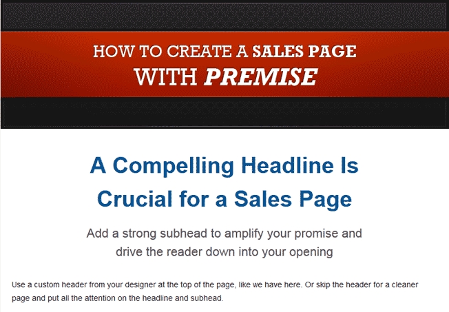 Probeer een landingspagina te schrijven als een verkoopbrief, want je wilt belangrijke acties aan je website-bezoekers vragen; of het nu gaat om het kopen van een product of het inschrijven voor een nieuwsbrief. Bekijk voor design-inspiratie eens het volgende voorbeeld van een verkoopbrief die gebruik maakt van Premise. Let op hoe de pagina de basiselementen van een verkoopbrief gebruikt, maar niet een onbetrouwbaar design dat de reputatie van je merk kan beschadigen.