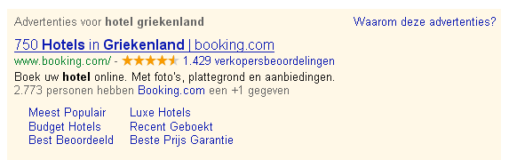 Bekijk vooral vanuit de ogen van de bezoeker of de sitelinks ook daadwerkelijk meerwaarde bieden aan de zoekopdracht. Wanneer dit niet zo is maak dan voor de advertentiegroepen een aparte campagne. Geef de bezoeker de kans om meteen naar het gedeelte van de website te navigeren waar hij naar op zoek is! Op deze manier ben je de bezoeker een klik voor en heeft hij deze ‘extra’ klik niet nodig op de website.