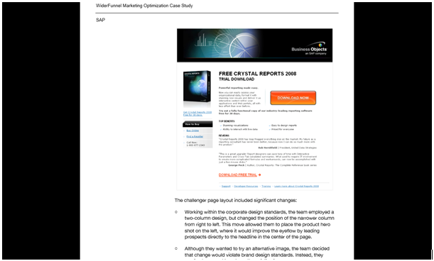 - Een nieuwe titel, die de waarde propositie van SAP communiceert: ‘gratis Crystal rapport 2008, proef download’. Deze titel kwam overeen met de AdWords advertentietekst.
