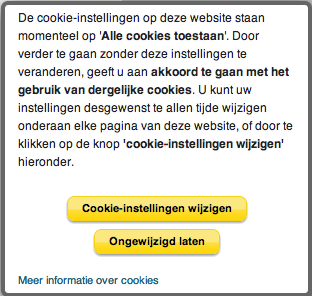 Over de wijze waarop toestemming verkregen moet worden is nog onduidelijkheid. OPTA kijkt daarvoor momenteel nauwlettend naar de ontwikkelingen in de EU en de vorderingen van de browserbouwers. OPTA zal echter wel onmiddellijk toezien op de informatieplicht. Het IAB werkt momenteel ook aan een “compliance guide” welke bedrijven informeert over de wijze waarop ze met de nieuwe wetgeving om moeten gaan. Links en rechts zie ik al wel oplossingen verschijnen. Veelal een overlay bij binnenkomst op de website met daarin de melding over het gebruik van de cookies. Zie de afbeelding hieronder die ik tegenkwam.