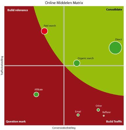 Het model combineert een tweetal metrics: traffic en conversie (zie onderstaand figuur). De assen zijn gebaseerd op de doelstelling van de metrics voor een bepaalde periode. De verticale as (y-as) laat in dit geval de traffic van het middel zien, waarbij de middellijn de doelstelling is. De horizontale as (x-as) doet hetzelfde met conversie (doelconversies/traffic). De kleur van de bol geeft aan of het middel een positieve ROI heeft en de omvang van de bol geeft de bijdrage van dat middel aan de omzet weer.