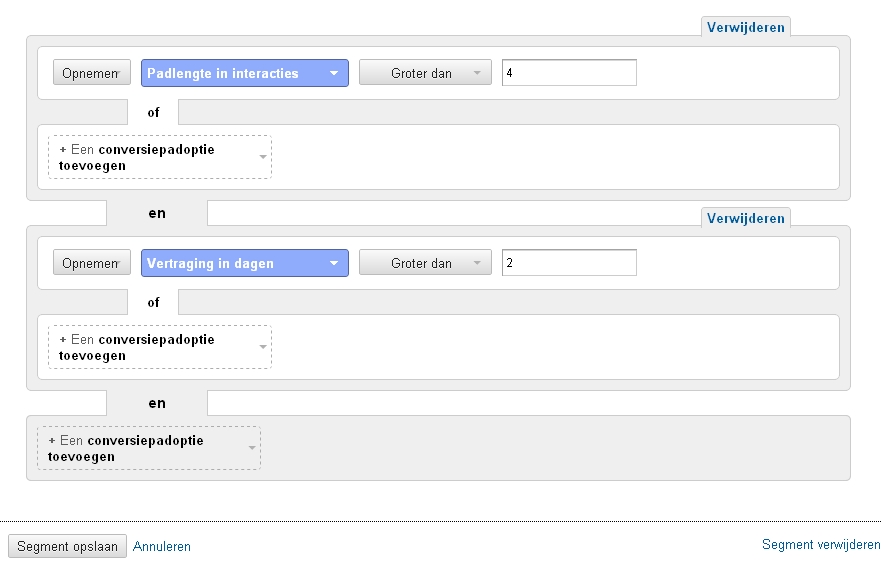Met de multi channel trechters is het mogelijk om de dagen en contactmomenten voor de conversie te meten. Hoe maak je een dergelijk conversiesegment aan?