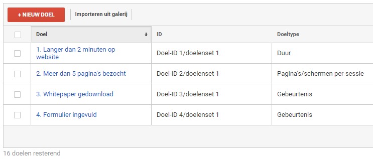 Vaak zijn Goals niet veel meer dan het aanmerken van tracking die toch al plaatsvindt, echter door er een Goal van te maken kun je bereikte doelen nog beter in je rapportage opnemen, of kun je segmenteren op het al dan niet behalen van doelen. Er zijn verschillende typen doelen in Google Analytics: