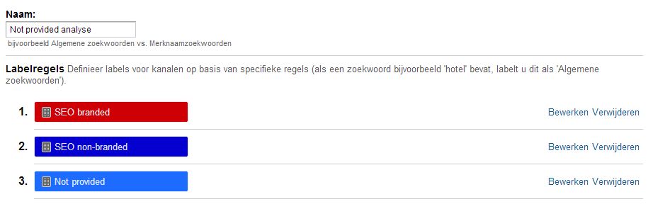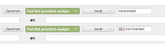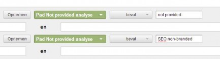 Vervolgens dien je een geavanceerd segment aanmaken met bijvoorbeeld ‘not provided’ en ‘SEO non-branded’: