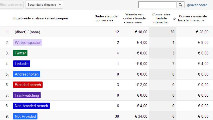 Dit geeft je een totaaloverzicht van jouw SEO resultaten. Hoe is de verhouding in conversies tussen je branded en non-branded zoekwoorden? En hoeveel bezoeken en conversies zijn afkomstig vanuit ‘not provided zoekwoorden’? In deze rapporten worden de conversies berekend op basis van het traditionele last-click model. Nu wil je natuurlijk weten wat de ondersteunende bijdrage is van SEO aan andere kanalen, zoals bijvoorbeeld Google AdWords.