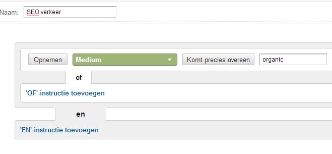 Veel Google Analytics-gebruikers zijn niet bekend met deze rapporten. Dat is jammer, want deze rapporten geven informatie over het gedrag van jouw bezoekers. Deze rapporten kun je vinden onder doelgroep &rarr& gedrag &rarr& engagement. Je dient wel een segment aan te maken om de engagement van je SEO bezoeken te kunnen analyseren. Maak hiervoor onderstaand segment aan: