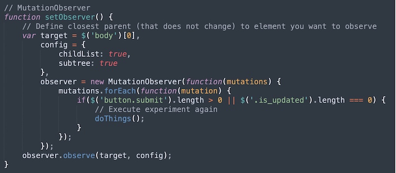 Omdat wij steeds vaker tegen deze problemen aanliepen, zijn wij na verloop van tijd overgestapt op andere A/B-testing software, die beter ondersteuning boden voor Single Page Applications (SPA), zoals ReactJS. In de praktijk bestond deze ondersteuning vooral uit het gebruik van een Javascript functie ‘MutationObserver’. Deze functie kan elementen in de DOM van de pagina monitoren, waarna je bij wijzigingen je experiment opnieuw kan toepassen. In theorie klinkt dit misschien als de perfecte oplossing, maar in de praktijk bleken de problemen vaak niet helemaal opgelost. Bij een iets complexere A/B-test moest je erg veel Javascript-code schrijven om te controleren of je experiment nog intact was, of dat React wijzigingen had gemaakt en je vervolgens je experiment opnieuw moest toepassen. Dit was erg inefficiënt en zorgde vaak voor flickering of verminderde gebruikerservaring. We zochten dus naar een alternatieve oplossing.