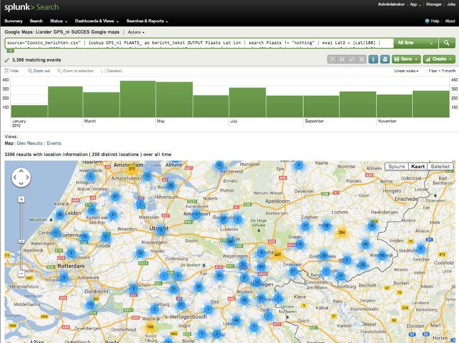 source=”Coosto_berichten.csv” | lookup GPS_nl PLAATS_ as bericht_tekst OUTPUT Plaats Lat Lon | search Plaats != “nothing” | eval Lat2 = (Lat/100) | eval Lon2 = (Lon/100) | eval _geo = Lat2+”,”+Lon2 | eval bericht_tekst2 = substr(bericht_tekst, 1, 40)+”…” | table bericht_tekst2 Lat2 Lon2 Plaats _geo