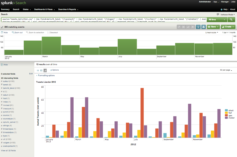 source=”Coosto_berichten.csv” | rex field=bericht_tekst “(?<a>elect)” | rex field=bericht_tekst “(?<b>gas)” | rex field=bericht_tekst “(?<c>fail)” | rex field=bericht_tekst “(?<d>meter)” | eval strings=mvappend(a,NULL,b) | eval strings=mvappend(strings,NULL,c) | eval strings=mvappend(strings,NULL,d) | mvexpand strings | timechart count by strings