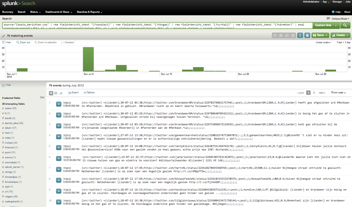 … en zie daar: de tweets – en groene balkjes per dag in juli – op het scherm!