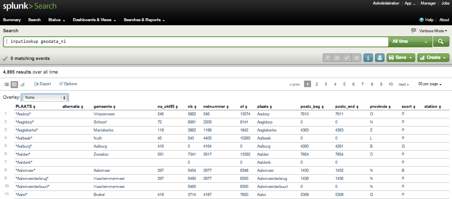 - Echte Big Data vraagt om het combineren van data-sets. Dit kan met een JOIN als de waarden in de kolommen van twee datasets gelijk zijn. Soms is dit echter niet het geval, zoals in onderstaande voorbeeld, waarin ik de plaatsnaam in een tweet wilde vertalen naar geo-coördinaten, zodat ik de Tweets op een kaart kon projecteren (oorspronkelijke Twitter geo-meta-data helaas niet beschikbaar). Dit doe je in Splunk met behulp van een LOOKUP tabel.