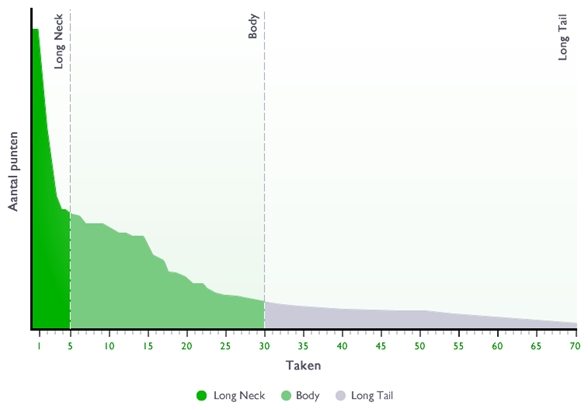 Na afloop van het onderzoek worden de punten per taak opgeteld en geplot in een grafiek. Volgens de theorie van McGovern zullen er een 5-tal taken zijn die er bovenuit springen: de zogenaamde Long Neck. Dit zijn de toptaken die je dient te optimaliseren om maximaal effect te behalen.
