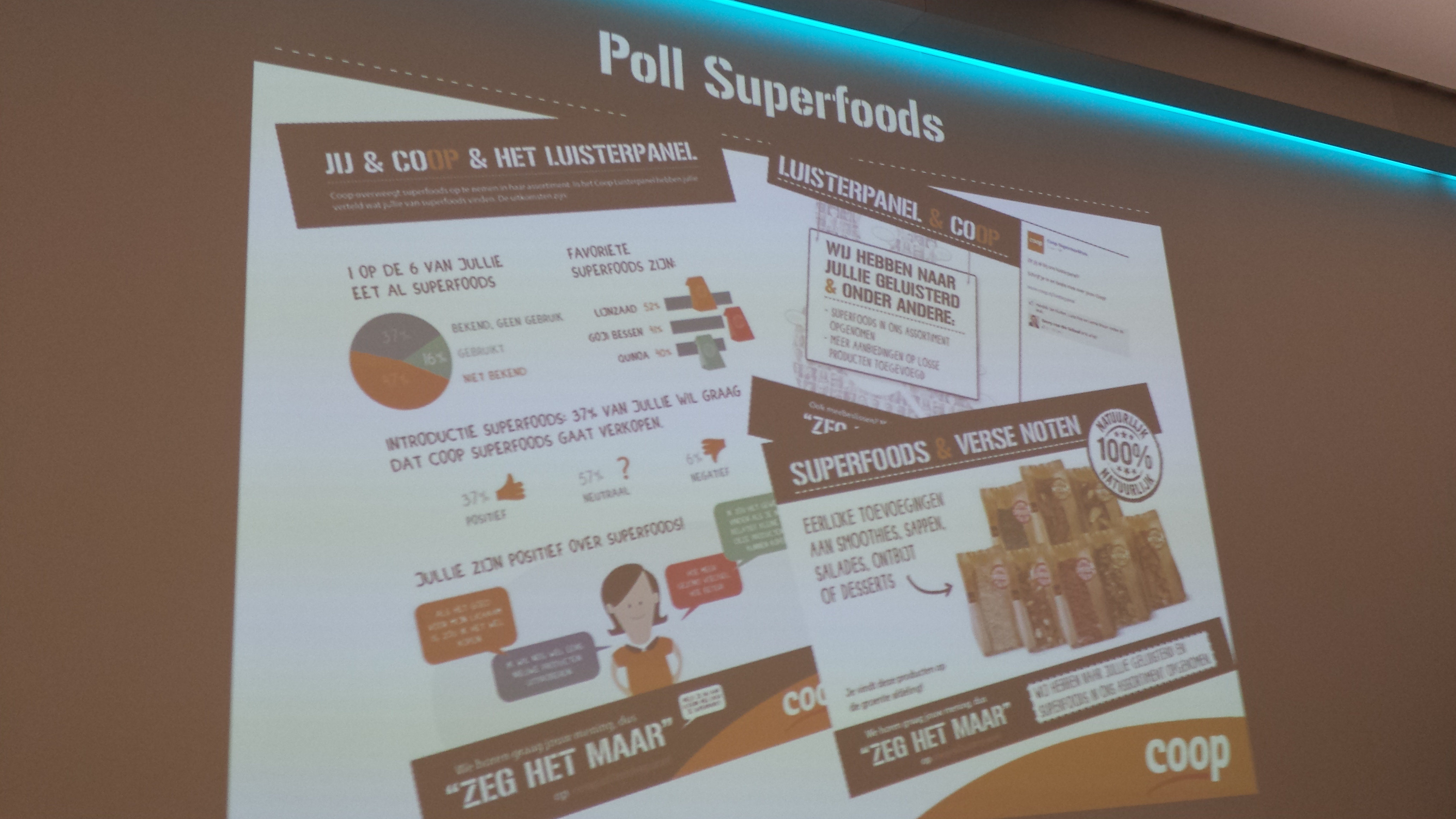 Door een dedicated panel van klanten vergaart Coop veel inzichten, deze inzichten worden gebruikt om het assortiment uit te breiden met nieuwe trendgevoelige producten zoals Superfoods, maar ook om feedback te krijgen over de inrichting van de winkel en marketinguitingen. Chris laat verschillende uitgevoerde onderzoeken zien en hoe de uitkomsten beslissingen en de marketing beïnvloed hebben. Door middel van (onder andere) infographics krijgt het panel terugkoppeling op het onderzoek.