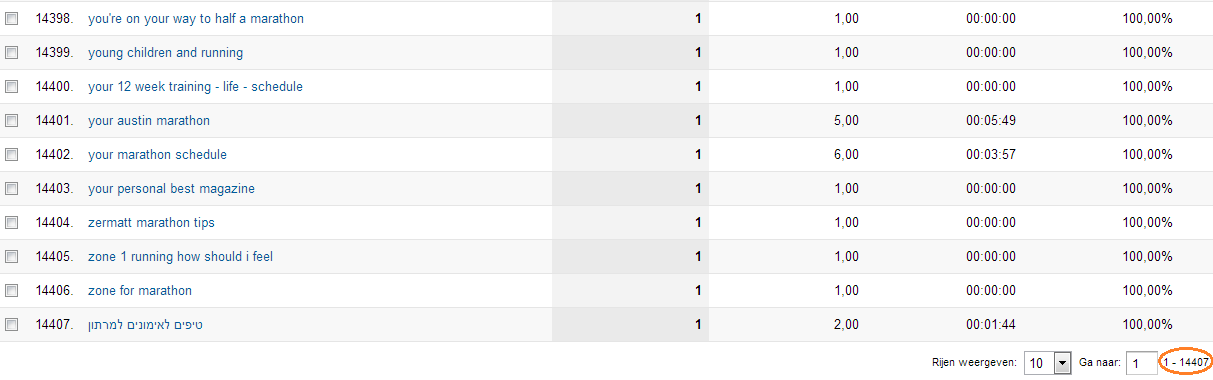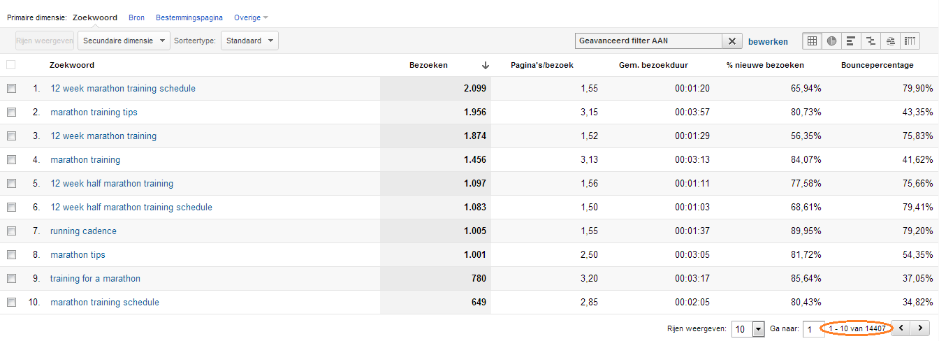 Je ziet dat in de geselecteerde periode  14.407 unieke zoekopdrachten bezoekers naar de website hebben gebracht. Google Analytics kan standaard 500 zoekwoorden weergeven in een scherm. Echter, via een API, maar ook in Google Analytics, kun je meer data tegelijk weergeven of exporteren.