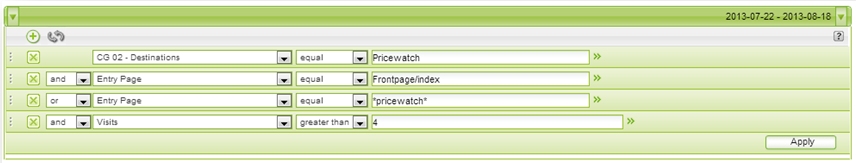 Gelukkig is er nu de beschikking over een pakket zoals Webtrekk. Naast het analyseren op ruwe data is een andere interessante feature aan Webtrekk de filter engine. Omdat analyses direct uitgevoerd worden op de ruwe data is het ook mogelijk om real-time te segmenteren. In de bovenstaande afbeelding is bijvoorbeeld een segment gemaakt op basis van verkeer binnen de Tweakers Pricewatch, waarbij het verkeer binnen is gekomen op de Frontpage of de Pricewatch en minimaal 4 bezoeken heeft gedaan. De analyse die hier uit komt (bv interne zoekwoorden, oid) zal direct gesegmenteerd worden.