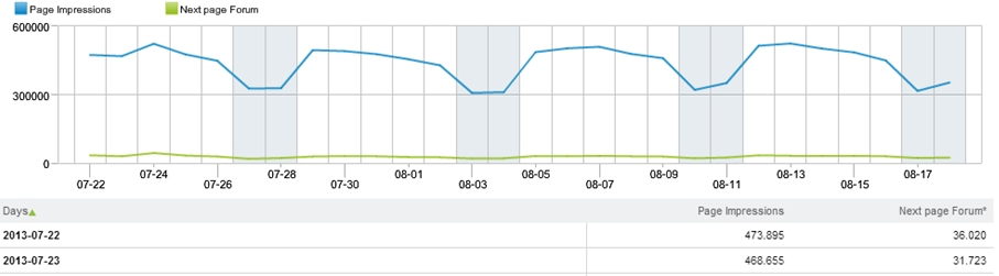 Een ander feature van Webtrekk die veel gebruikt wordt binnen Tweakers, is de mogelijkheid om een metric te filteren op basis van criteria in een andere metric. Dat klinkt complex, maar is het niet. Laat ik even uitleggen aan de hand van een klein voorbeeld; Omdat Tweakers uit zoveel verschillende onderdelen bestaat is het erg interessant om te weten naar welke bestemmingen bezoekers gaan vanaf de homepage (de meeste van de bezoeken beginnen hier). In het rapport hieronder zie je het aantal page impressies per dag. Tot nu toe weinig spannends. Binnen dit rapport is een tweede metric gemaakt “next page Forum”. Deze metriek is gemaakt door het aantal pageviews weer te geven onder de voorwaarde dat de volgende pagina een pagina binnen het Tweakers Forum is. Om deze metric te maken is het niet nodig om naar allemaal configuratie schermen te gaan, de metric kan on the fly toegevoegd worden. De metric “leeft” ook alleen binnen deze analyse (het is natuurlijk wel mogelijk om deze op te slaan).